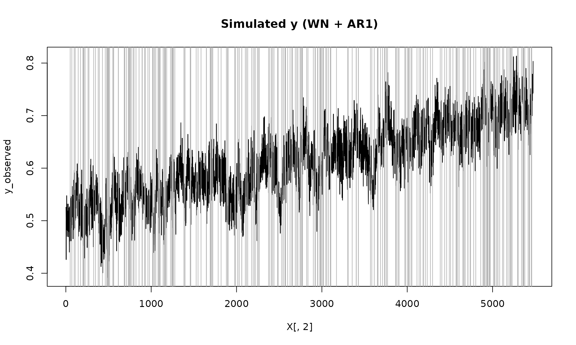 plot(X[, 2], y_observed, type = "l", main = "Simulated y (WN + AR1)")
