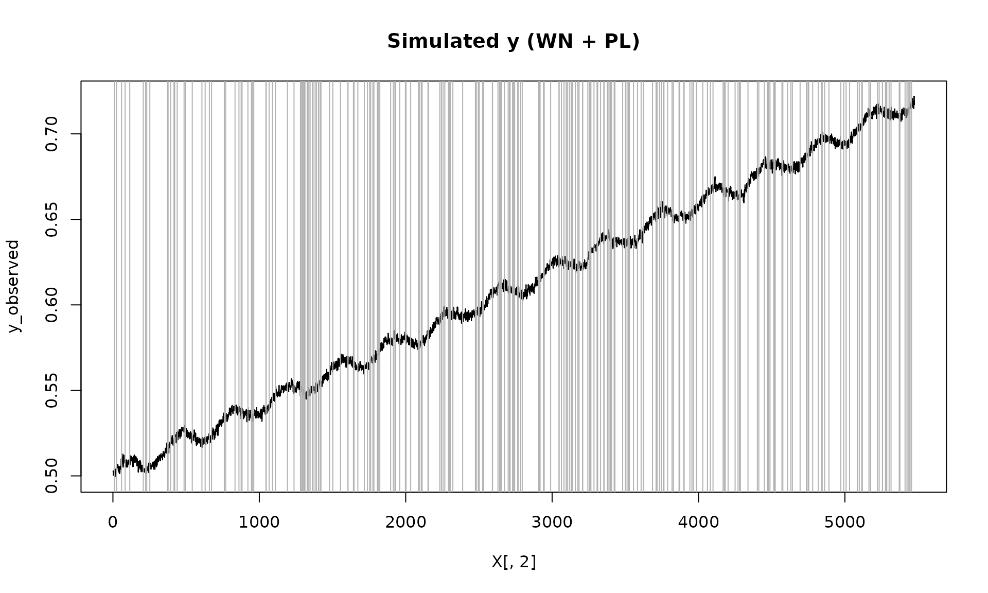 plot(X[, 2], y_observed, type = "l", main = "Simulated y (WN + PL)")